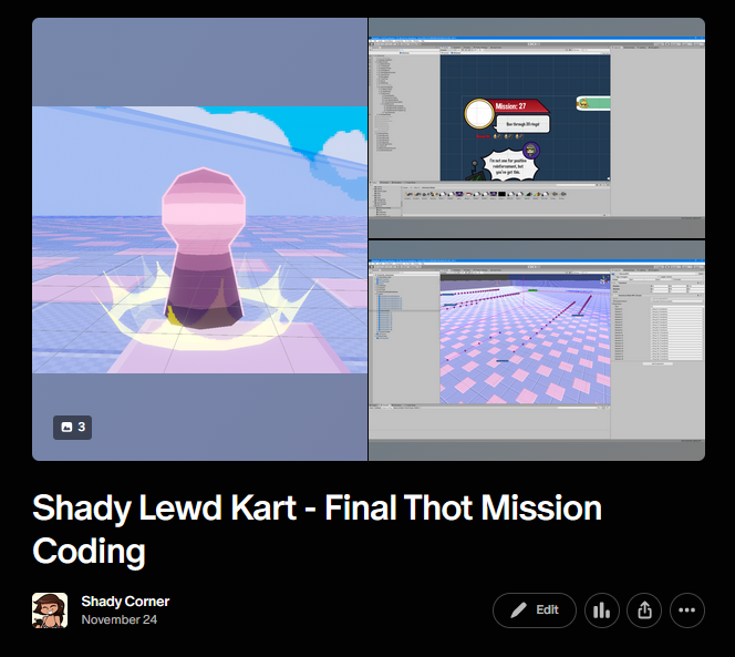 You can read about the systems we made here https://www.patreon.com/posts/shady-lewd-kart-144290258 But in short we now have full mission bases we can use with our powerups and upgrades. Ways to add dialouge and rewards and a full gameplay loop!